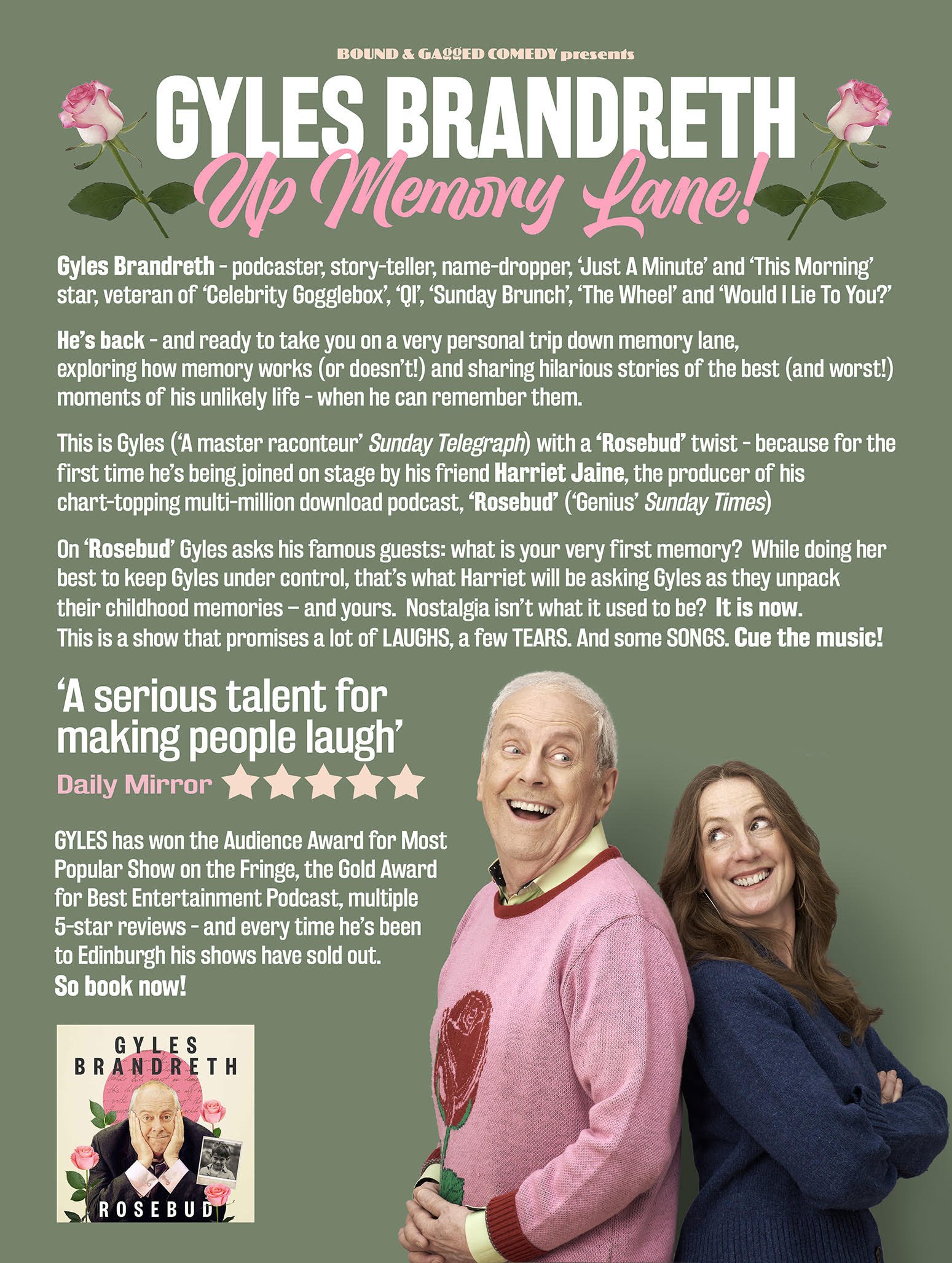 This is Gyles (‘A master raconteur’ Sunday Telegraph) with a Rosebud twist - because for the first time he’s being joined on stage by his friend Harriet Jaine - the producer of his chart-topping multi-million download podcast, Rosebud (‘Genius’ Sunday Times).